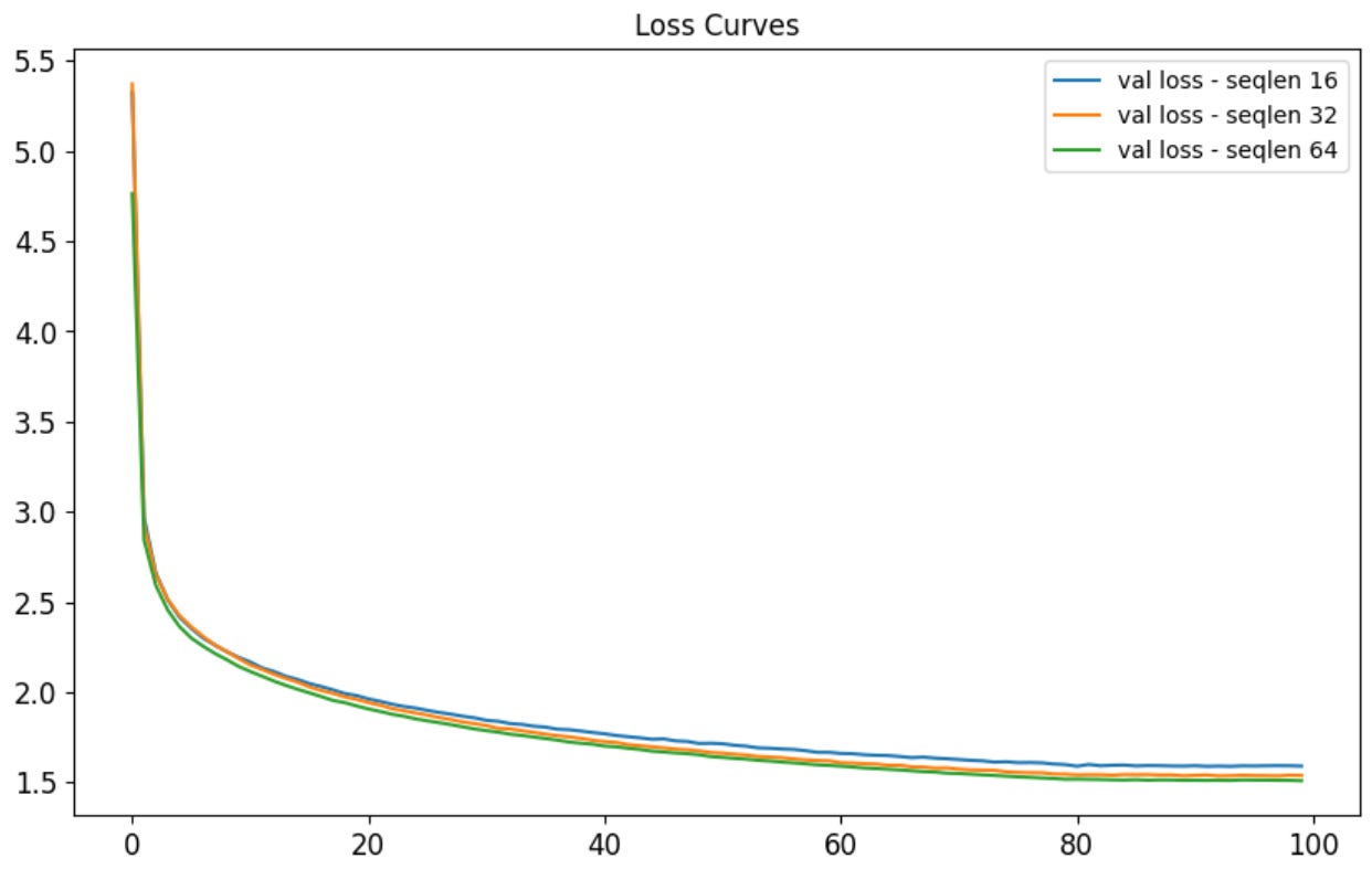 Here are the validation losses for sequence lengths 16, 32, and 64: