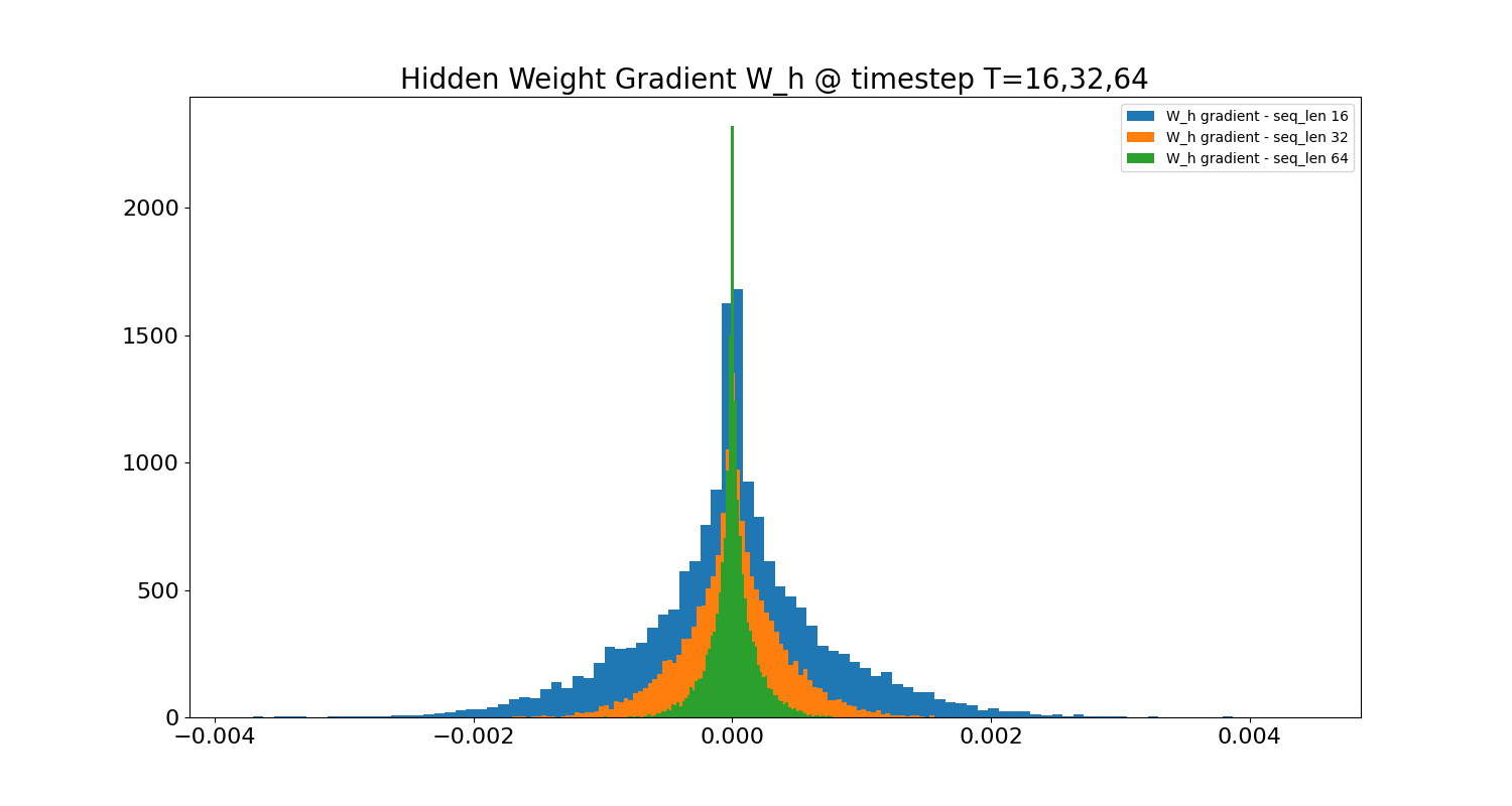 The first two cases explain the exploding and vanishing gradient phenomena present as we try to increase the sequence length T. We can see this in the gradient histograms of the hidden weight W_h measured at the last token index T halfway through each training run: