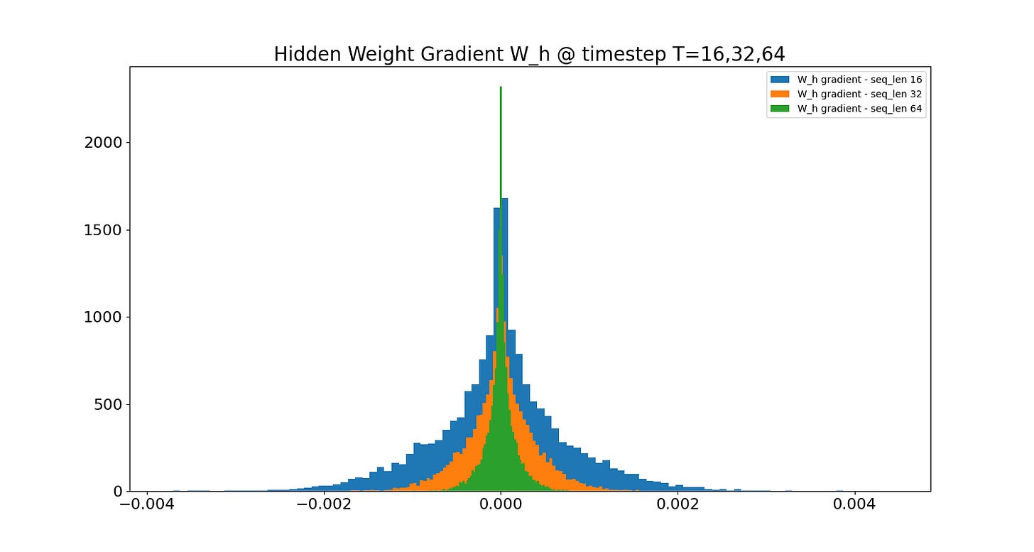As the sequence length increases, the distribution of the hidden gradients converges to a sharper peak at zero. This problem is the primary motivation behind orthogonal weight initialization. Initializing the recurrent weights as an orthogonal matrix ensures the norm of its eigenvalues is 1, preventing an exploding or vanishing magnitude in the transformation of the input. Of course, like we saw in Part 2, the values of the weights are dynamic, and special initialization only takes us so far. This is why architectural improvements to the vanilla RNN have been pursued, the most notable of which is the long short-term memory (LSTM), which we will see on the next post.