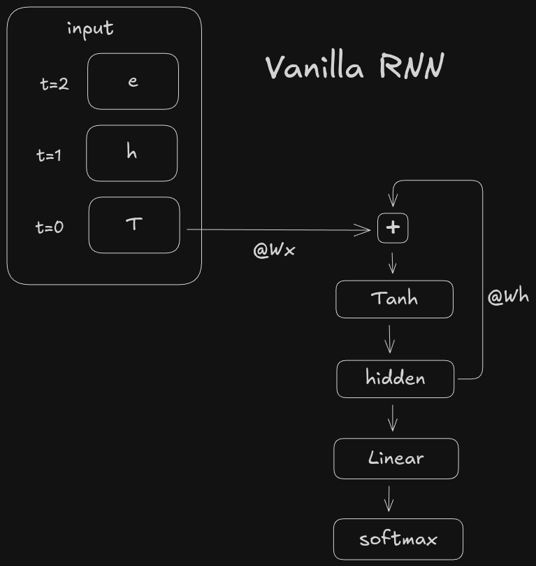 where x_t is the embedding of the current token and W_x and W_h are learned weight matrices. Of course other activations can be used besides tanh, and you can add bias to the input and/or hidden state terms if you want. The important thing to note is the weights W_x, W_h, and W_o are shared across each token t. This enables us to crank up the ctx_window without increasing the parameter count.