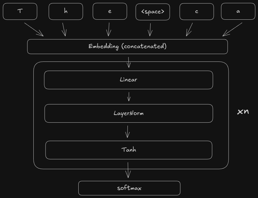 In this model, we are concatenating ctx_window character embeddings into a single feature vector, then passing it through the fully connected layers. One problem with this design is the impact the ctx_window has on the number of trainable parameters. With 4 linear+layernorm+tanh layers, our model has 313,743 parameters. Currently, our ctx_window is only 8, meaning we only have a “history” of 8 characters. So we can’t really expect the model to be able to track dependencies in the character stream beyond the most recent 8 characters. If we want to increase the ctx_window to have a deeper “history”, the problem is that this blows up the number of parameters in the first linear layer, since its dimensions are ctx_window * embed_dim, hidden_dim). For example, increasing ctx_window from 8 to just 16 doubles the number of parameters of the first linear layer from 65536 to 131072. In other words, our current model doesn’t scale with the input length.